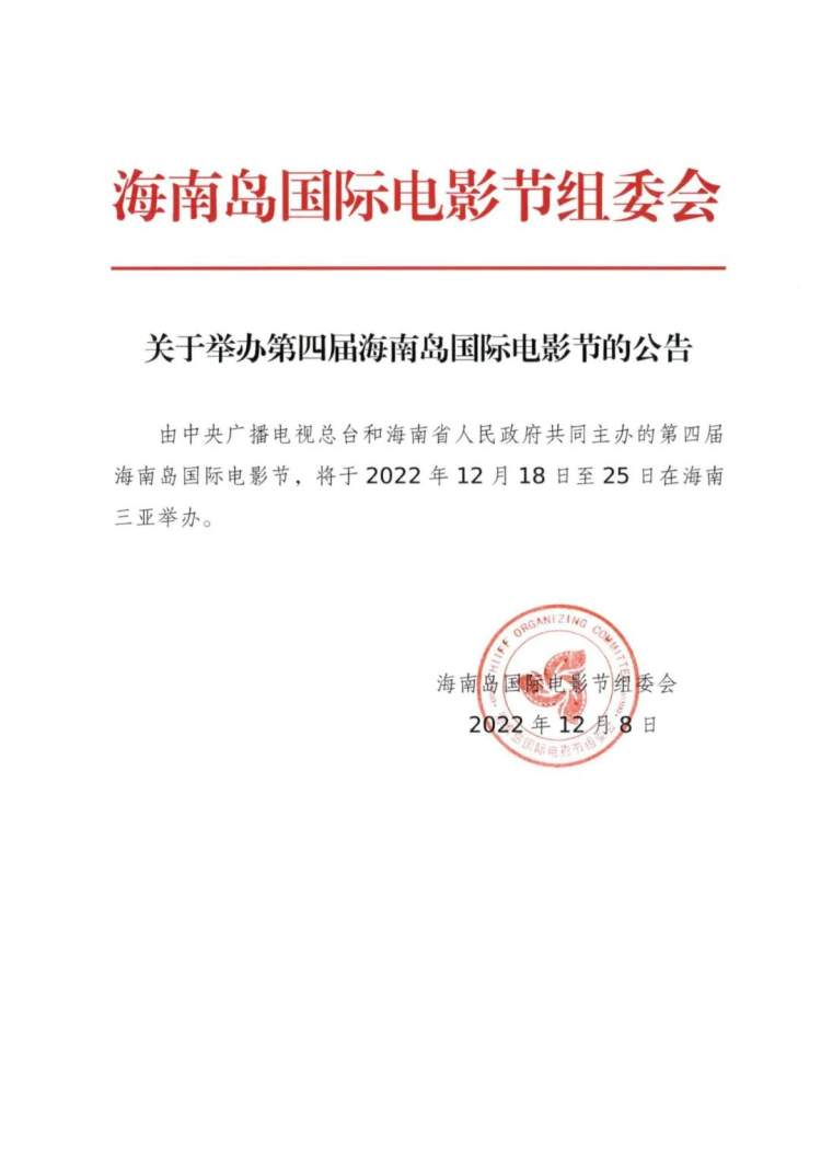 2022海南岛国际电影节恢复举办 周到君 2022-12-08 来源:周到上海 海南岛电影节官微8日上午发布公告,恢复举办2022海南岛国际电影节,时间定于12月18日至25日在三亚举办。 来源:周到上海 作者:周到君 赞一个 (0)