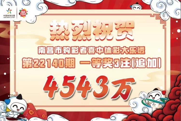 体彩中心的信息显示,江西中出的3注1514万元追加投注一等奖全部出自南昌一体彩实体店,中奖彩票为一张经3倍投的单式追加倍投票,单票擒奖4543万元。