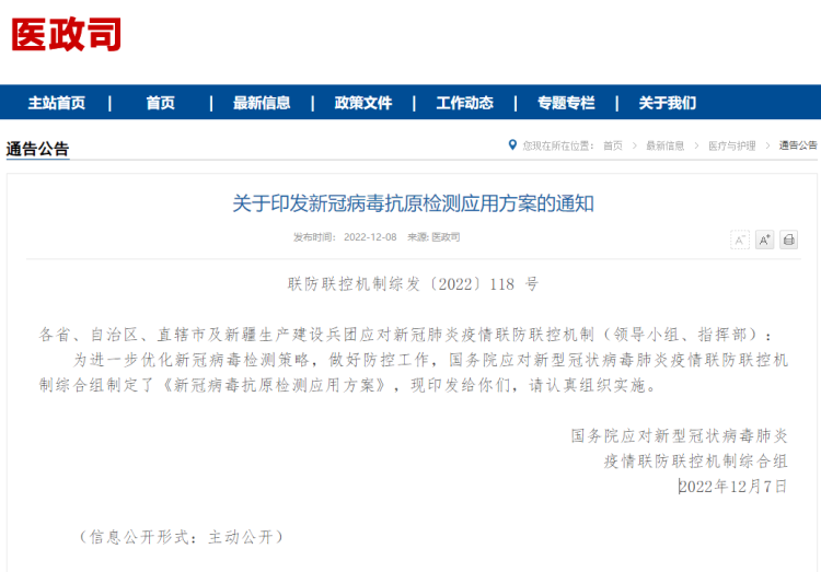12月8日,国家卫生健康委发布《关于印发新冠病毒抗原检测应用方案的通知》,通知称,抗原检测具有感染早期灵敏度高的特点,为指导有需求人员自主、规范做好新冠病毒抗原检测发布抗原检测应用方案。