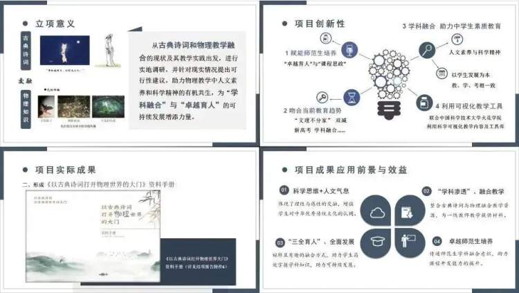 组员们介绍,在一年的研究周期中,除了撰写现状调查报告以外,项目组开发了21个微课示范课视频以及配套的课件和教案,创建“古典诗词打开物理世界大门”公众号并定期推送视频资源,成果丰富且具有实用价值,为跨学科教学实践提供了有益的实践经验和借鉴思路。