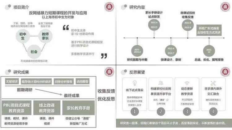 这个项目经过了微课录制、投放和反馈,以及总结优化的阶段。前期调研包括查阅文献、现存统计资料分析、问卷分析、访问报告等环节,打造课纲、教材、教师资源使用手册等PBL项目式课程资源,同时配合线上微课教育资源,且创设了清键公众号推广家长教育手册,构建了一个家校社区反网暴资源共享平台,动态更新教学资源。同时,项目组成员还附带撰写了配套的家长指导手册,并深入中学与一线政治学科教师探讨该项目引入道德法制课教学的可行性。