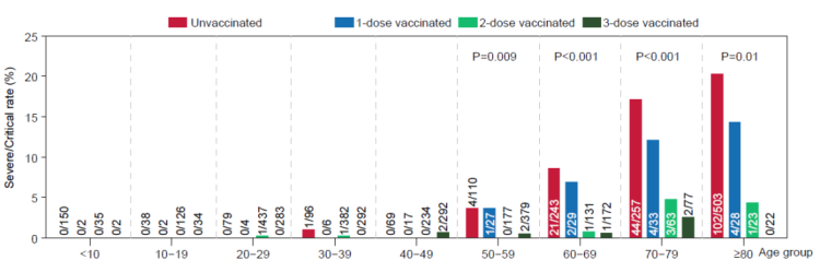 对患者按年龄大小进行分组,发现重症/危重症的比例随着患者年龄的增长而逐渐升高,但在每个年龄段中疫苗接种人群的重症比例都显著低于未接种人群的比例,且降低程度与疫苗接种剂次高度相关。例如,在60~69岁、70~79岁、≥80岁等三个年龄段,未接种疫苗患者的重症/危重率分别为8.64%、17.12%和20.28%;接种1剂疫苗患者的重症/危重率分别为6.90%、12.12%和14.29%,接种2剂疫苗患者的重症/危重率分别为0.76%、4.76%和4.35%,接种3剂疫苗患者的重症/危重率分别为0.58%、2.60%和0.00%。