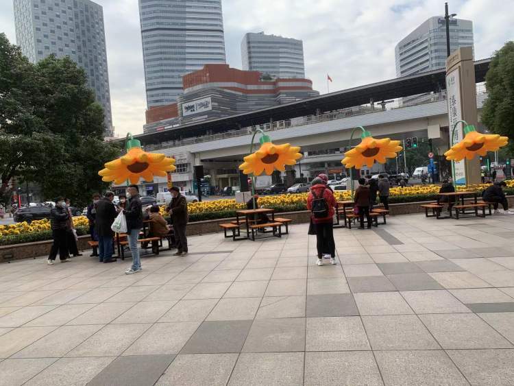 长宁路凯旋路路口,不少爷叔阿姨都在长宁龙之梦城市生活中心门外“乘风凉”,长条板凳上一坐,头顶的“向日葵”便缓缓“绽放”了。