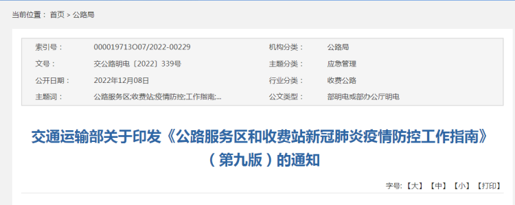 据交通运输部网站消息,为更加科学精准做好公路服务区和收费站新冠肺炎疫情防控工作,交通运输部及时对《公路服务区和收费站新冠肺炎疫情防控工作指南》(第八版)进行了修订,落实“不再对跨地区人员查验核酸检测阴性证明和健康码”、“不再开展落地检”等要求,细化了服务区和收费站风险区域划分范围,增加了推动公路防疫检查点应撤尽撤等内容。