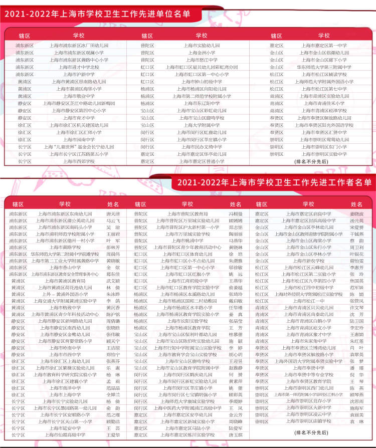 日前,经学校申报、区级遴选、专家评审、网上公示等程序,由上海市科技艺术教育中心组织开展的“2021-2022年上海市学校卫生工作先进单位和先进工作者评选”顺利结束,共评选出50所上海市卫生工作先进单位、100名上海市卫生工作先进工作者。在疫情防控常态化的背景下,这些先进单位与个人有序开展学校卫生与健康教育工作,不仅体现了优秀的专业素质与工作能力,也为进一步提高上海市学校卫生保健人员专业水平,进一步提升学校卫生与健康教育工作提供了先进做法与特色经验,为全面提高学校健康教育质量贡献了智慧。