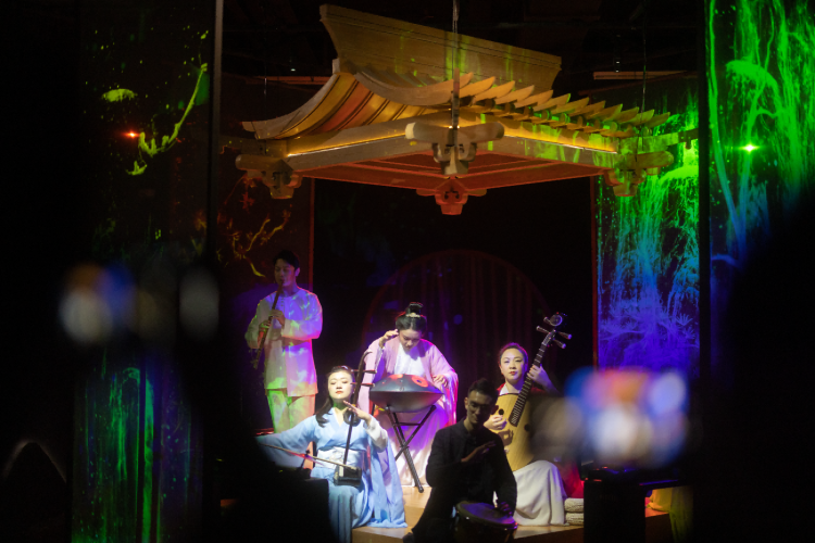 “乐∞新空间”从2021年10月开启的“何似在人间——新国乐沉浸艺术特展”于今年8月闭展,特展深受观众喜爱,不少人带着朋友、孩子前来打卡,学习国乐知识。《梦了个梦》沉浸式国风音乐剧场就这样延续了“何似在人间”五个展厅不同风格的国风美陈,保留其“高士-侠客-将士-佳人-智者”五大主题国风元素,再配合沉浸式国风音乐剧场剧情全新呈现,灯光音效全面升级,观众以全新的“如梦人”身份,重新步入新国乐艺术空间,“沉浸式”感受国乐所焕发出的全新活力。