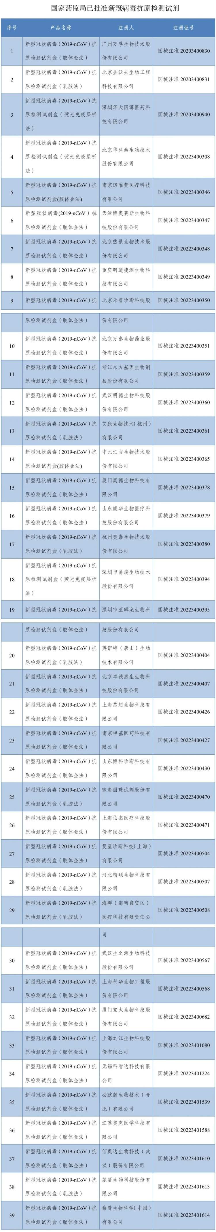 名单公布!39个新冠病毒抗原检测试剂已获批 2022-12-11 来源:新华社 国家药监局已批准39个新冠病毒抗原检测试剂 12月9日,经国家药监局审查,批准佰奥达生物科技(武汉)股份有限公司、基蛋生物科技股份有限公司和泰普生物科学(中国)有限公司3个企业的3个新冠病毒抗原检测试剂产品。截至目前,国家药监局已批准39个新冠病毒抗原检测试剂产品。 药品监督管理部门将加强相关产品上市后监管,保护患者用械安全。 来源:国家药品监督管理局官网 监制:姜晨 编辑:周喆、王宜玄 赞一个 (0)