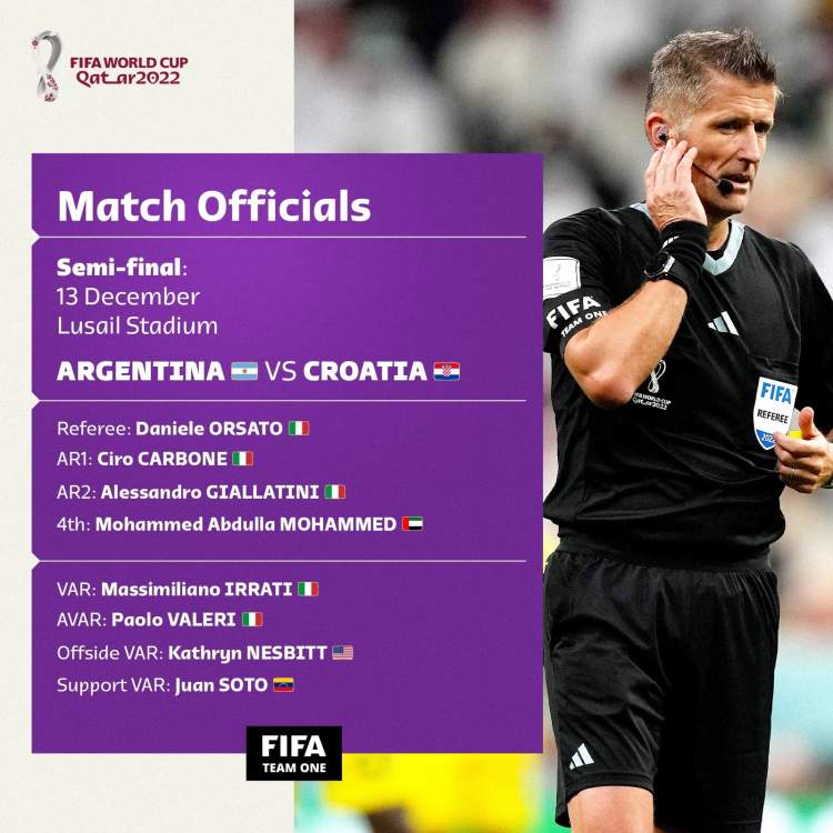 赛前,本场比赛主裁判安排已经出炉,曾执法阿根廷小组赛的意大利名哨奥尔萨托将担任本场比赛主裁,VAR裁判是同样来自意大利的伊拉蒂。