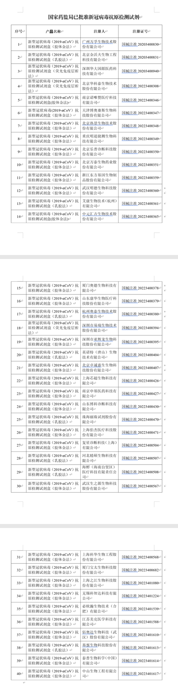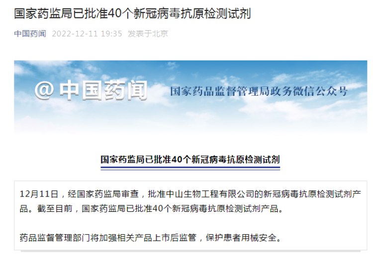 国家药监局已批准40个新冠病毒抗原检测试剂 周到君 2022-12-12 来源:周到上海 据国家药品监督管理局政务微信公众号消息,12月11日,经国家药监局审查,批准中山生物工程有限公司的新冠病毒抗原检测试剂产品。截至目前,国家药监局已批准40个新冠病毒抗原检测试剂产品。 药品监督管理部门将加强相关产品上市后监管,保护患者用械安全。 附:国家药监局已批准新冠病毒抗原检测试剂 来源:周到上海 作者:周到君 赞一个 (0)