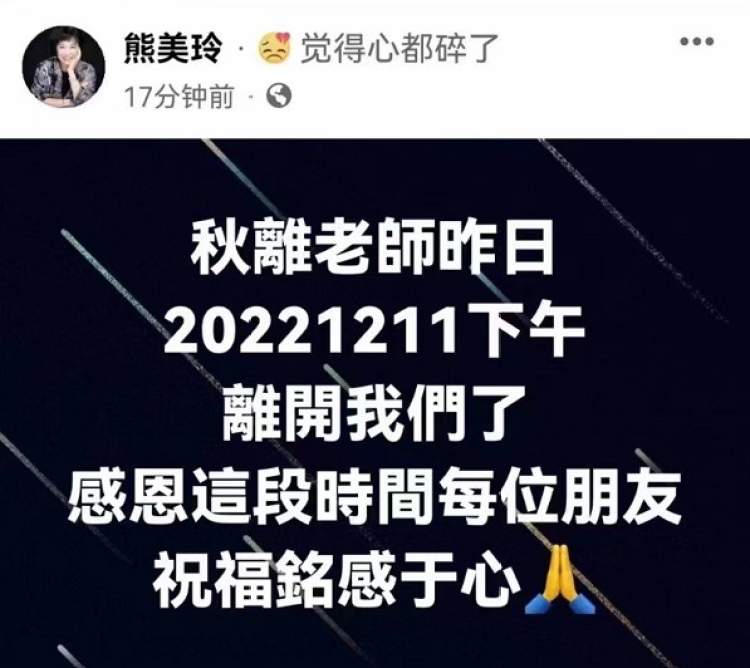 今日,音乐人熊美玲发文,其丈夫、知名音乐人林秋离,于12月11日下午离开人世,终年62岁。