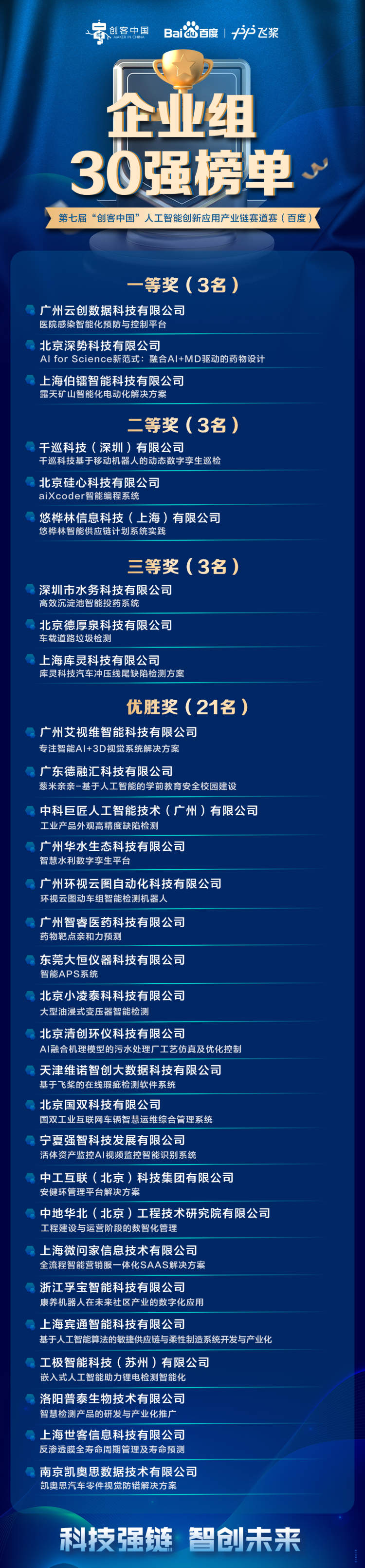第七届“创客中国”人工智能创新应用产业链赛道赛(百度)50强获奖企业和项目名单: