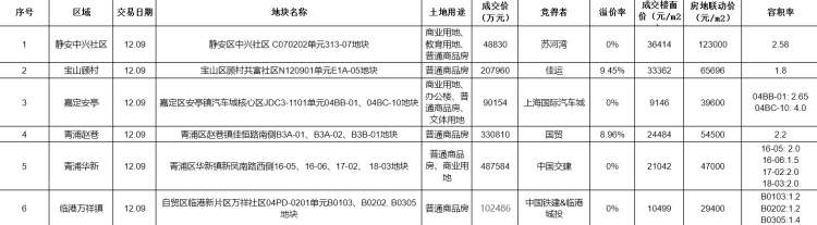 在今日的土拍中,佳运以207960万元竞得宝山区顾村共富社区N120901单元E1A-05地块,溢价率9.45%,为今日溢价率最高的一宗地块;国贸以330810万元竞得青浦区赵巷镇佳恒路南侧B3A-01、B3A-02、B3B-01地块,溢价率8.96%。