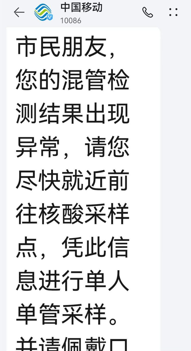Q先生因为住在杨浦区,他不清楚其他区的这个做法杨浦区是不是适用。一直等到昨天(12月11日)晚上7点多,Q先生收到了市防控办通过中国移动发来的短信通知,“市民朋友,你的混管检测结果出现异常,请您尽快就近前往核酸采样点,凭此信息进行单人单管采样。并请佩戴口罩……”