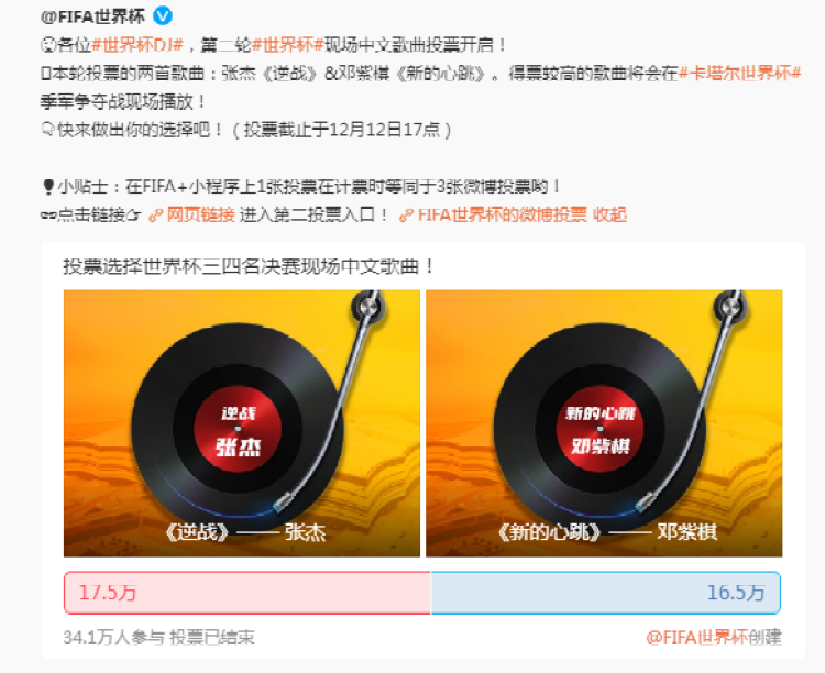 记者发现,第二轮世界杯现场中文歌曲投票正在进行中!