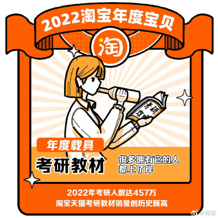 数据显示,2022年考研人数大达到了457万,淘宝天猫考研教材销量创历史新高。