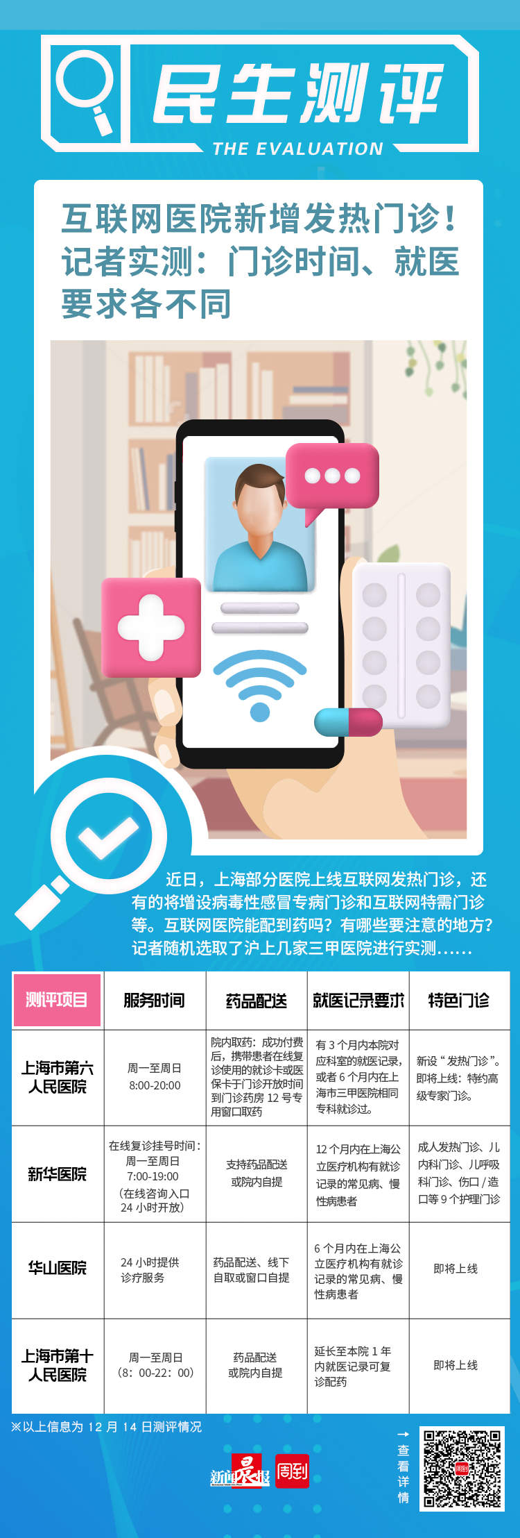 另外,互联网发热门诊是新生事物,院方也在探索提升防控措施的可操作性和针对性,为了最大限度满足上海市民求医问药需求,建议广大市民根据实际症状,挂号互联网医院上相应的专科门诊,听取专科医生意见。