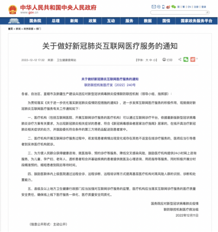 近日,国务院联防联控机制医疗救治组发布《关于做好新冠肺炎互联网医疗服务的通知》。《通知》要求,医疗机构(包括互联网医院、开展互联网诊疗服务的医疗机构)可以通过互联网诊疗平台,依据最新版新型冠状病毒肺炎诊疗方案有关要求,为出现新冠肺炎相关症状的患者、符合《新冠病毒感染者居家治疗指南》居家的,在线开具治疗新冠肺炎相关症状的处方,并鼓励委托符合条件的第三方将药品配送到患者家中。
