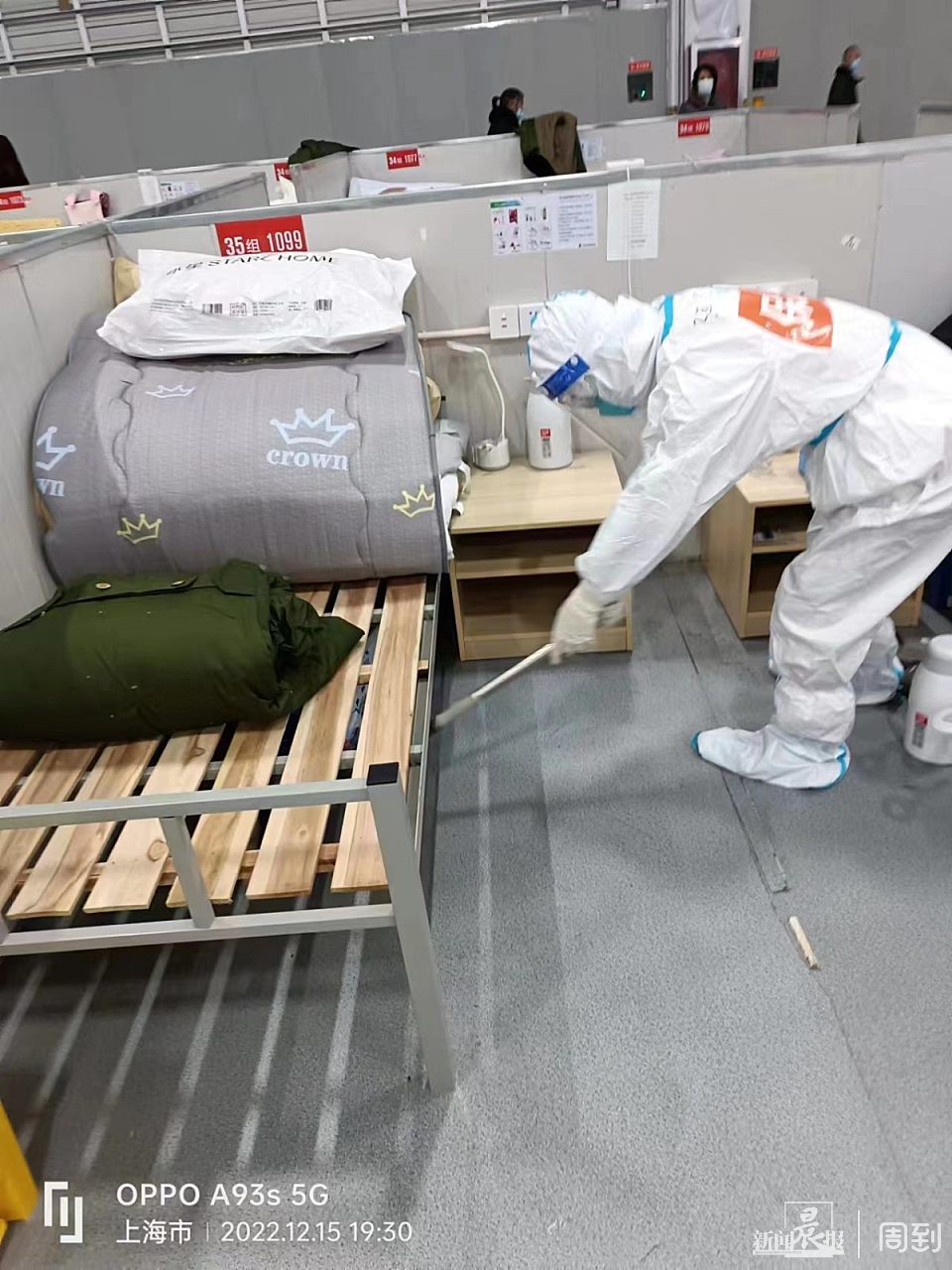 在方舱里,我的工作内容还和之前一样,打扫卫生、消毒、发放食物等等。最近,气温比较低,我们特地给那些仍住在方舱的人多准备了一床被子,还有一些军大衣备用。但我能明显体会到,这次接触的患者,对我们和医护人员都多了更多的包容与理解。而让我没想到的是,在方舱工作期间,一段电影都不敢拍摄的剧情,竟在我的身上真实地上演。
