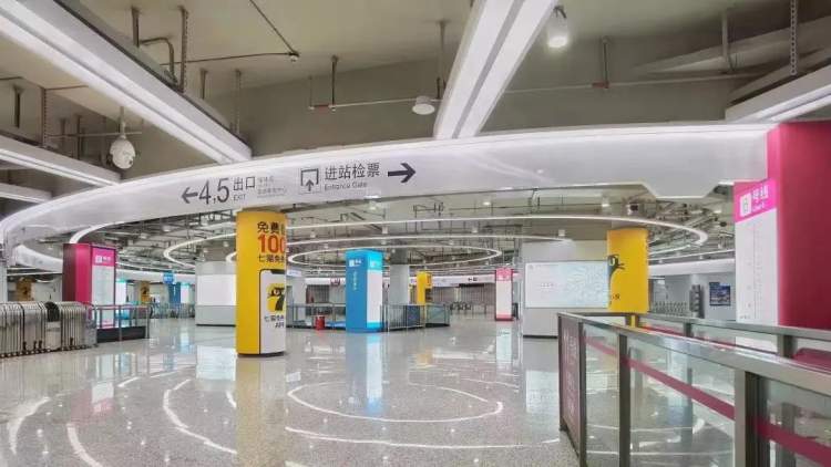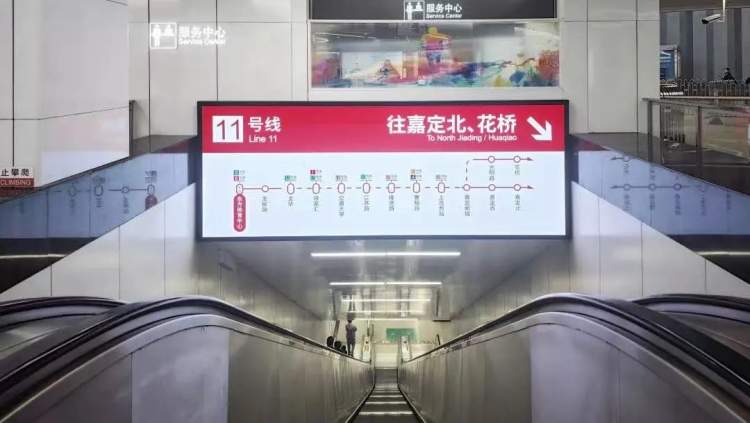 在站厅各自动扶梯上方,启用了梯眉电子屏显示,以图片及文字形式,为乘客呈现乘客当前所需要前往的站台方向和末班车时间,更高效地指引乘客。