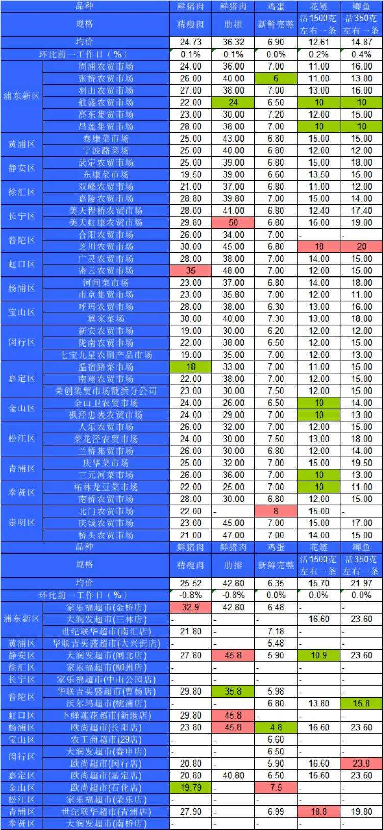 ■粉底标注代表该肉蛋鱼品种在上述农贸市场或超市的最高价;绿底标注代表该肉蛋鱼品种在上述农贸市场或超市的最低价