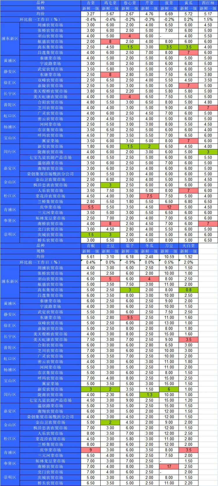 ■粉底标注代表该蔬菜品种在上述农贸市场或超市的最高价;绿底标注代表该蔬菜品种在上述农贸市场或超市的最低价