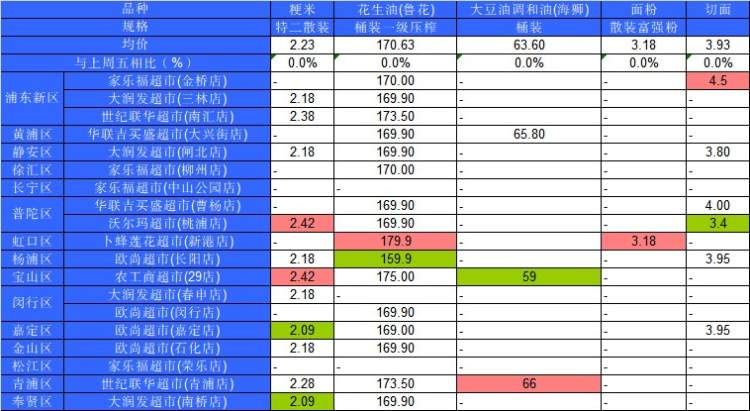 ■粉底标注代表该粮油品种在上述超市的最高价;绿底标注代表该粮油品种在上述超市的最低价