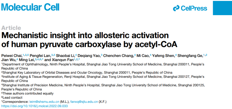 近日,上海交通大学医学院范先群院士团队和精准医学院执行院长雷鸣教授团队联合研究揭示了葡萄膜黑色素瘤糖异生关键酶别构激活机制,也阐明了乙酰辅酶A如何别构调控丙酸羧化酶的这一关键科学问题,研究结果以论著形式于近日发表于Cell子刊Molecular Cell。