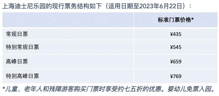 12月23日晚间,上海迪士尼度假区公布上海迪士尼乐园票务调整方案。该调整方案将于2023年6月23日起实行。调整后,上海迪士尼乐园的基础票价,也就是常规日票为475元,比现在票价上调40元;特别常规日为599元,比现在上调54元;高峰日为719元,比现在上调60元;特别高峰日为799元,比现在上调30元。 自2023年6月23日起,上海迪士尼度假区将在现行四级票价结构下调整上海迪士尼乐园的门票价格,各级定义及对应的票价如下: