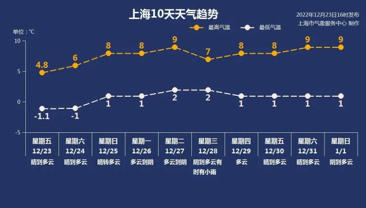 上海中心气象台预报,受较强冷空气影响,明天早晨市区最低气温-1℃,有薄冰,郊区-5℃~-3℃,有冰冻或严重冰冻,大家要注意做好保暖工作。白天晴到多云,西北风4~5级,相对湿度65%~20%,预计最高温度仅6℃。火险等级气象指数:4级,易燃,注意用火用电安全。