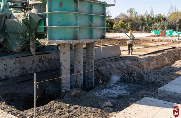 据了解,这里是崇太长江隧道的盾构始发井,也是未来隧道的出口所在地。39米,约13层楼高的三轴搅拌桩下端有三个钻孔,利用搅拌桩机将水泥喷入土体并充分搅拌,使软土硬结而提高地基强度。三轴搅拌桩的施工是为接下来地下连续墙的施工做准备。