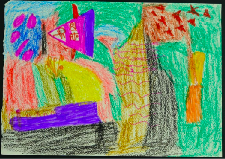 在杂杂村幼儿园,4岁的丹增桑杰将浓彩重墨洒向纸面。在他的画笔下,插于火箭的国旗上的星星飞了出来,变成了天上的星星。