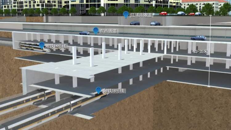 施工过程中,在浦东大道和民生路路口形成地面道路、轨交、隧道叠加。地面道路为浦东大道,地下一层为南北向的江浦路越江隧道,地下二层为浦东大道地道(东西通道),地下三层为轨道交通14号线和18号线换乘层,地下四层为轨交14号线,地下五层为轨交18号线。