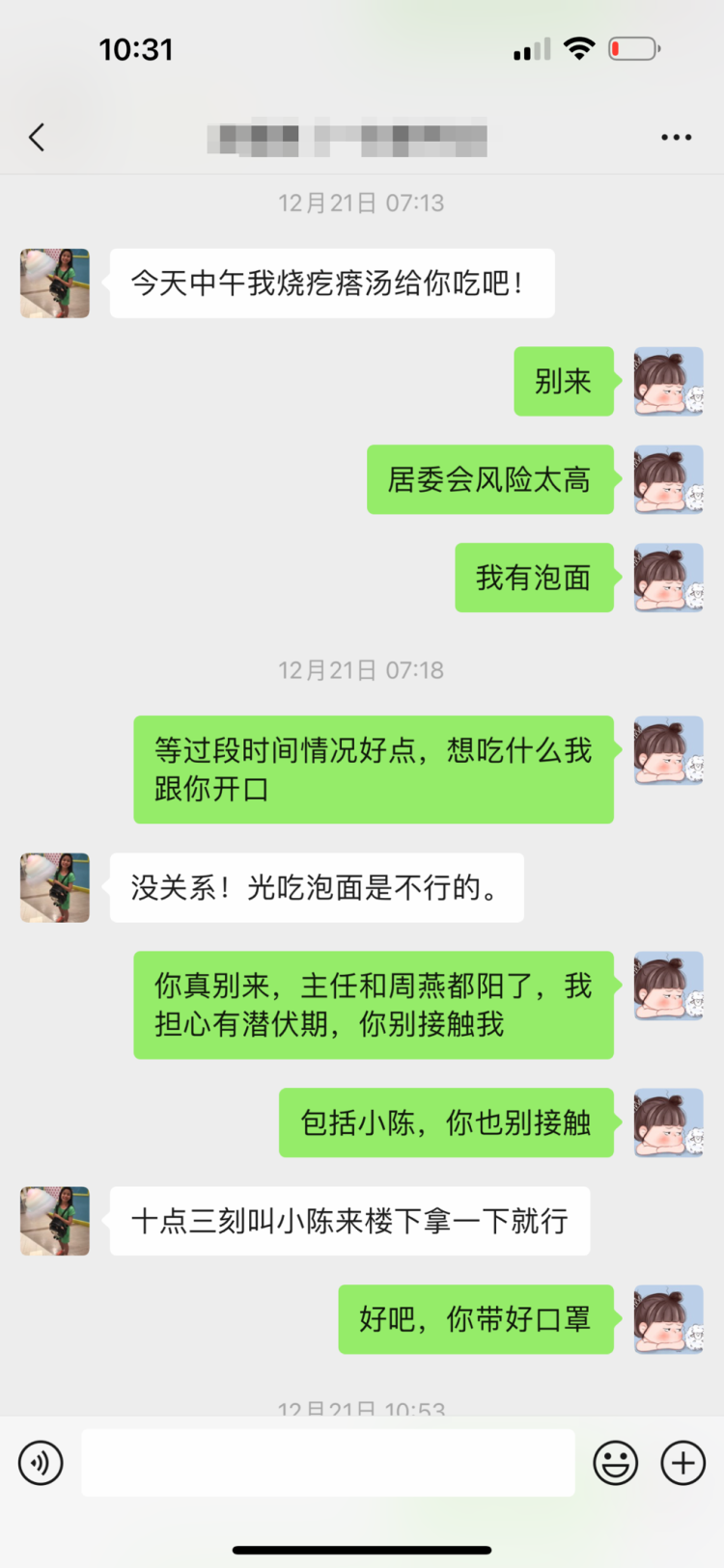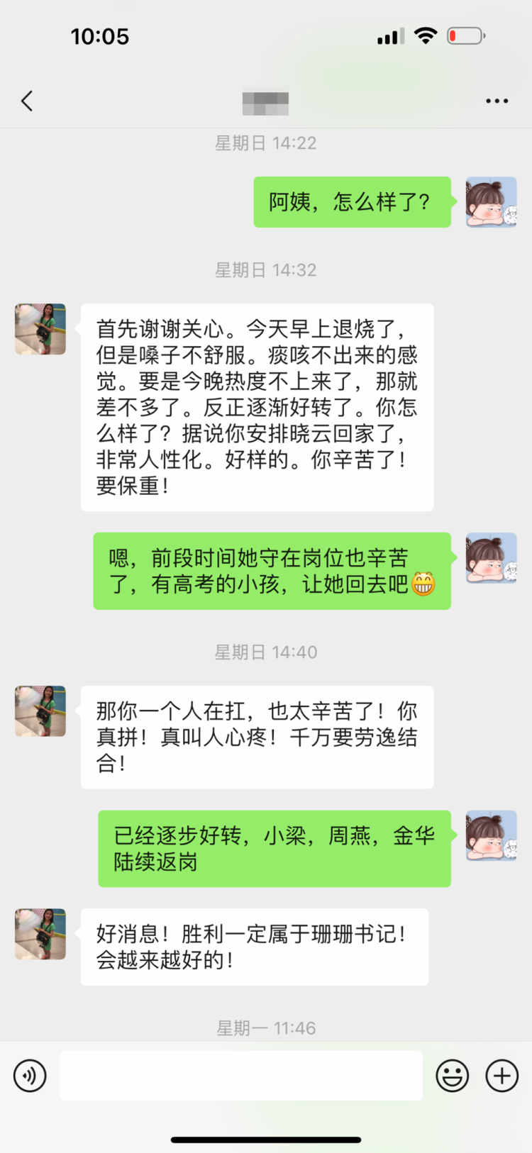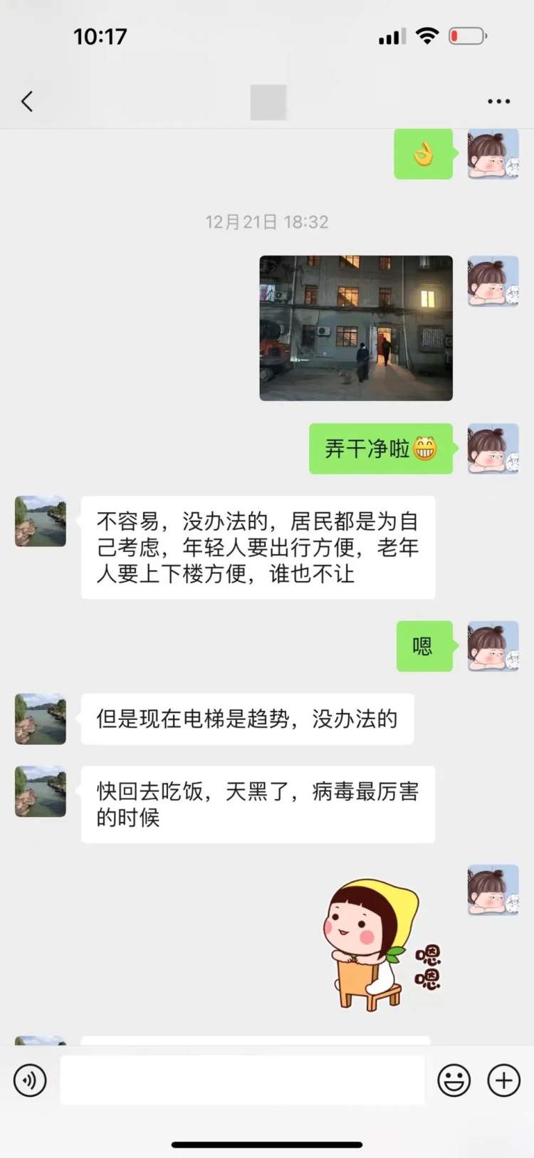 为保障社区工作正常运转和居民生活的日常需求,董珊珊急在心里,想在心头,但工作不能按“暂停键”。一台电脑、一部手机,职责不忘,时刻在岗,她自己发着高烧,一边工作,还要一边电话照顾远在松江的“中招”亲人,社区里的大事小情,她照样“接单”,及时反馈解决,电话问候、数据统计、代配药品、关爱老人、接单派单、保障需求等工作,一样都没落下。12月21日,群众来电反映,100号楼加装电梯工程在未经施工许可和征求居民同意情况下,私自将门头进行拆除,群众反映强烈。董珊珊得知情况下,第一时间协调派出所和包保干部,主动深入现场与加梯公司沟通协调,不到5小时,拆除门头恢复原状,群众纷纷拍手称赞。