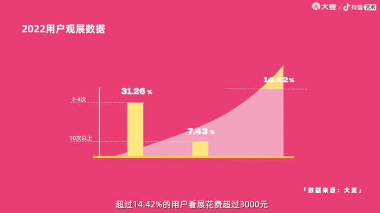 不仅如此, 2022年大麦上观展次数达到2至4次的观展用户占全部观展用户的31.26%,5至10次的用户占比为23.99%,而观展10次以上的用户也有7.43%,这也意味着,超六成用户有多次观展消费行为。为了实现“看展自由”,超过14.42%的用户年度观展花费超过3000元。可以说,观展正在成为用户城市文化消费的重要组成部分和新生活方式。