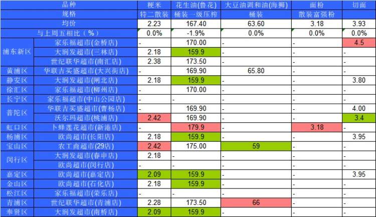 ■粉底标注代表该粮油品种在上述超市的最高价;绿底标注代表该粮油品种在上述超市的最低价