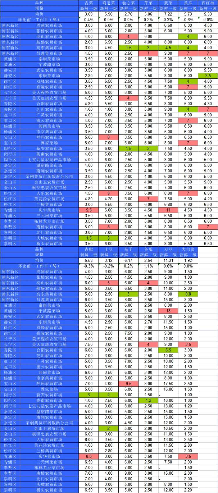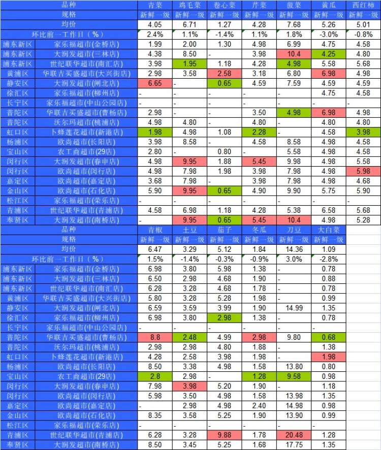 ■粉底标注代表该蔬菜品种在上述农贸市场或超市的最高价;绿底标注代表该蔬菜品种在上述农贸市场或超市的最低价