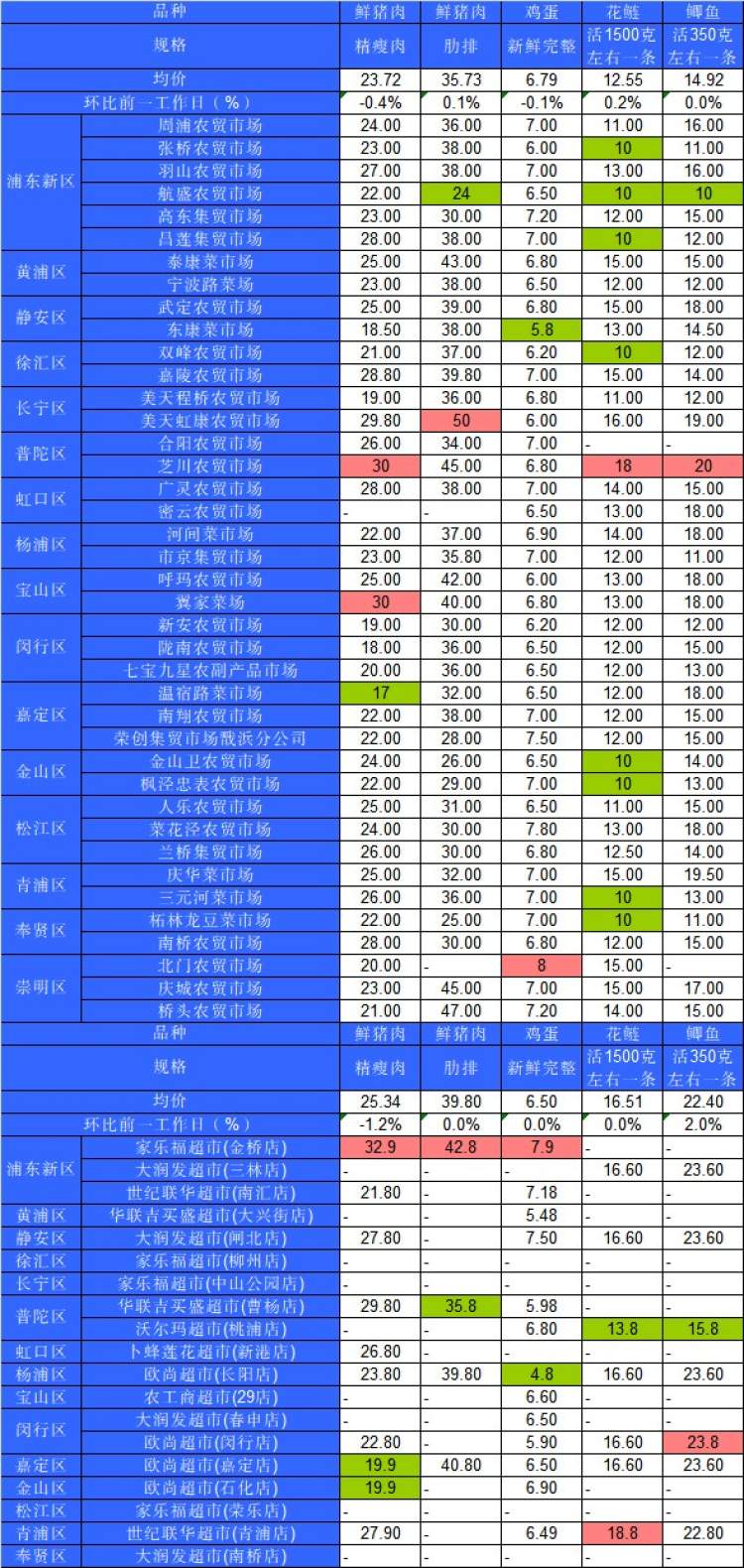 ■粉底标注代表该肉蛋鱼品种在上述农贸市场或超市的最高价;绿底标注代表该肉蛋鱼品种在上述农贸市场或超市的最低价