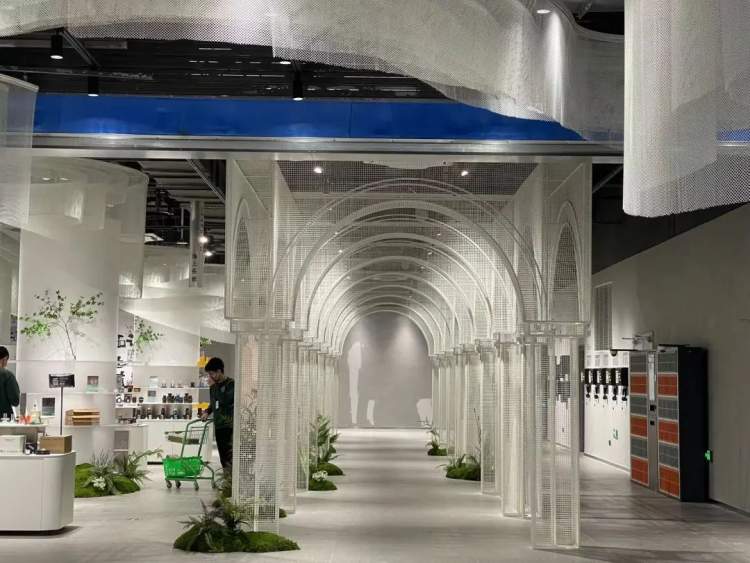 在中庭内,矗立着一座巨型“光启之门”艺术装置,这是利用3D打印技术重现的土山湾牌楼,设计师运用数字化设计手段,对传统的土山湾牌楼形态进行解构、抽象化并重新生成,形成网格化镂空的新牌楼形象,体现了科技与文化的融合,传统与未来的呼应。