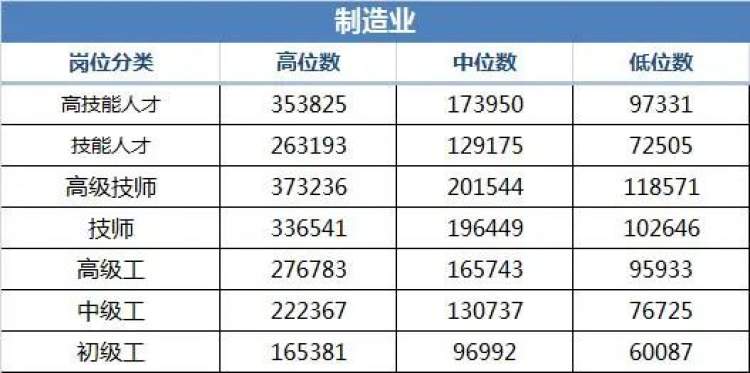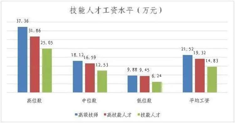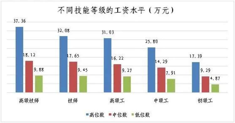 从高位数看,高级技师为37.36万元,技师为32.08万元,高级工为31.03万元,中级工为25.80万元,初级工为17.39万元。除初级工外,各等级均有明显增长,涨幅按等级从高到低依次为7.5%、6.9%、23.8%和25.4%。