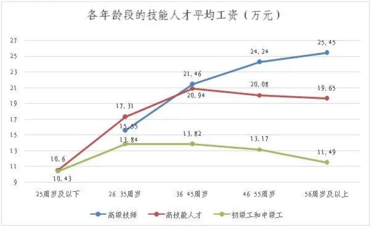 在46周岁以上的事业稳定期,高技能人才平均工资为19.98万元,比初、中级工的12.74万元高7.24万元。其中高级技师平均工资逐年增加,在56周岁及以上达到顶峰,为25.45万元,为初、中级工的2.21倍。
