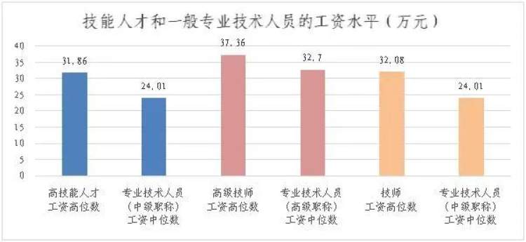 2021年,高技能人才的工资高位数为31.86万元,比专业技术人员(中级职称)中位数24.01万元多7.85万元;高级技师的工资高位数为37.36万元,比专业技术人员(高级职称)中位数32.7万元多4.66万元;技师的工资高位数为32.08万元,比专业技术人员(中级职称)中位数24.01万元多8.07万元。