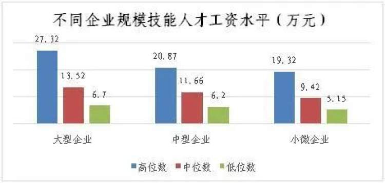 2021年,大型企业的技能人才工资中位数为13.52万元,同比增长13.6%;高位数为27.32万元,同比增长9.7%。中型企业中位数为11.66万元,同比增长5.8%;高位数为20.87万元,同比增长2.3%。小微型企业中位数为9.42万元,同比增长0.2%;高位数为19.32万元,同比减少0.9%。