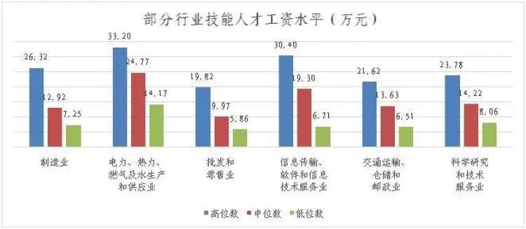 从行业看,2021年技能人才工资中位数位列前三的是“电力、热力、燃气及水生产和供应业”“信息传输、软件和信息技术服务业”“科学研究和技术服务业”,分别为24.77万元、19.30万元和14.22万元,比全部技能人才工资中位数(12.53万元)分别高12.24万元、6.77万元和1.69万元。
