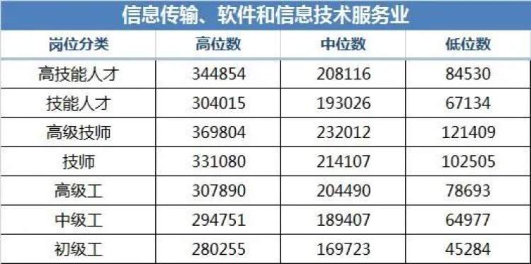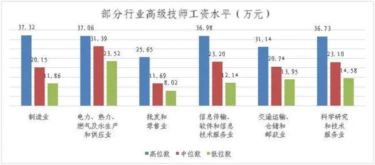 高级技师工资高位数位列前三的是“制造业”“电力、热力、燃气及水生产和供应业”“信息传输、软件和信息技术服务业”,分别为37.32万元、37.06万元和36.98万元。