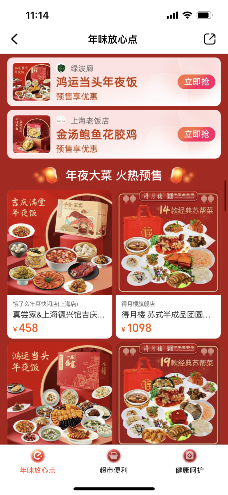 除了“家宴”礼盒预定,各个城市的消费者也可以上饿了么随时买到本地老字号的特色年菜。