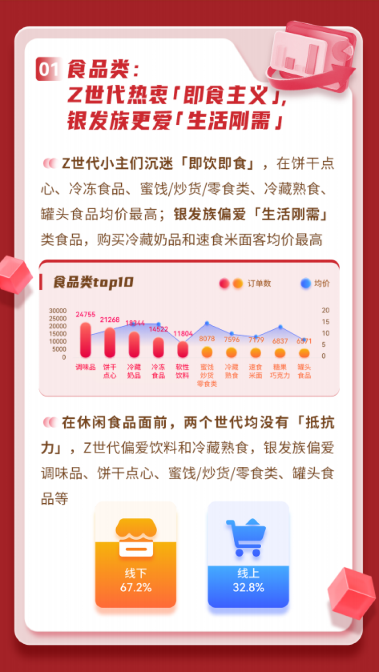 此外,面对不同的消费市场,各类族群也呈现出不同的消费偏好表现,《报告》在数据类比后发现,食品类别方面,Z世代热衷“即食主义”偏爱饼干点心、冷冻食品,银发族则更偏爱“生活刚需”,购买冷藏奶品和速食米面客均价最高。在生鲜类别方面,线下场景消费远高于线上消费。