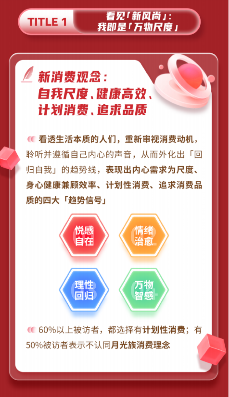外部环境与生活形态的改变,导致消费者表现为更为务实、克制和计划性。《报告》显示,“60%以上被访者,都选择有计划性消费;甚至有50%被访者表示不认同月光族消费理念”。