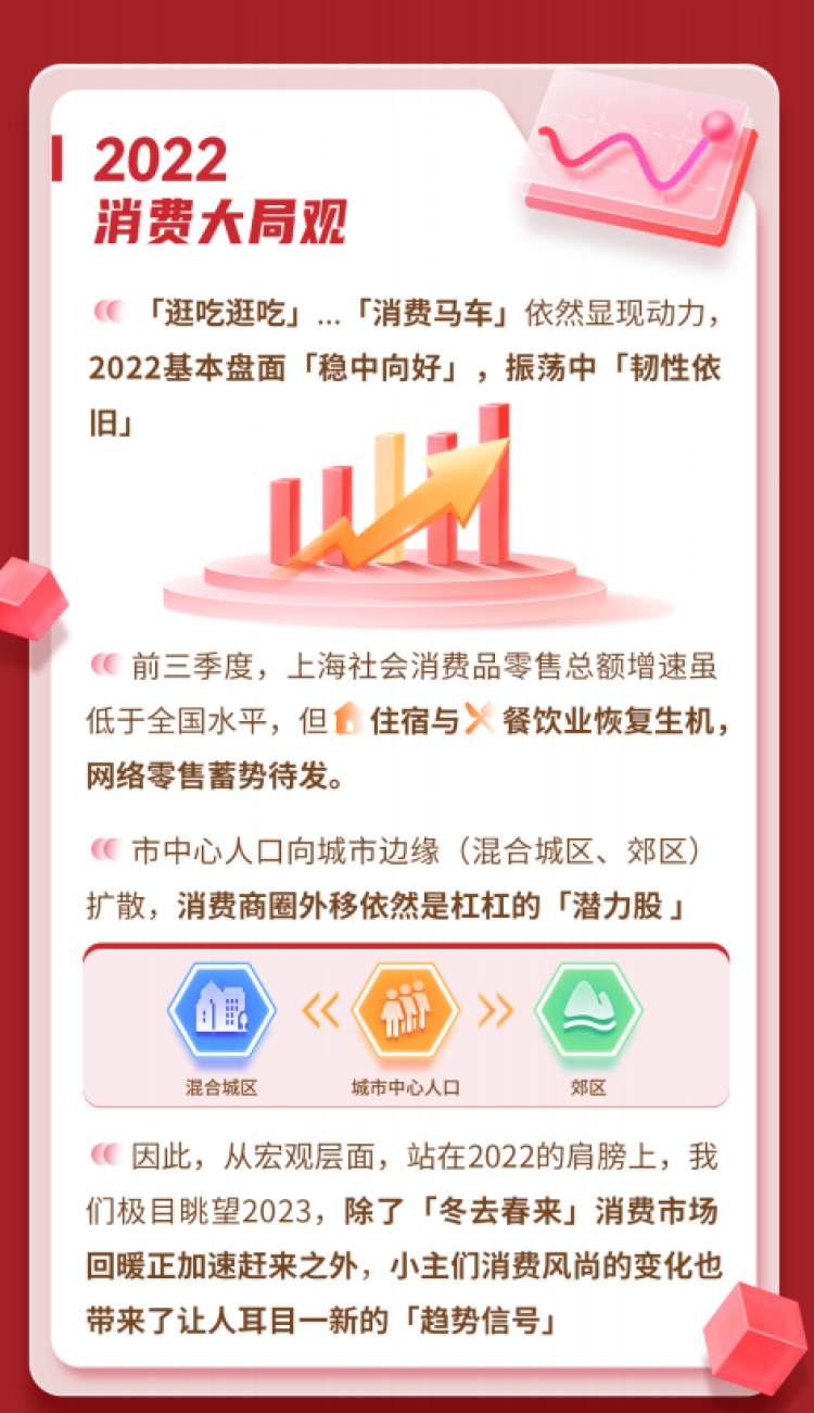 2022年12月30日,i百联发布《乐享美好生活 2022-2023年上海本地消费生活趋势报告》(以下简称《报告》),站在旧年与新岁更替的时间节点,旨在通过全景的态势分析,洞见后疫情时代上海消费市场的远景趋势,同时从新风尚、新市相、新风向多角度的行业数据分析,来看懂“这一届消费者”的心理变化、生活形态以及消费习性。