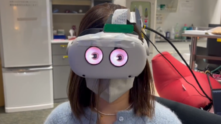 据新浪VR报道,近日,日本电视台(NTV)的研发实验室展示了一款 Meta Quest 2,前面粘着两个圆形显示屏。它们充当用户双眼,上面覆盖着红色的静脉,没有眼睑。连接(包括电路板)从显示器眼睛引向外部计算机,该计算机为眼睛提供动画。