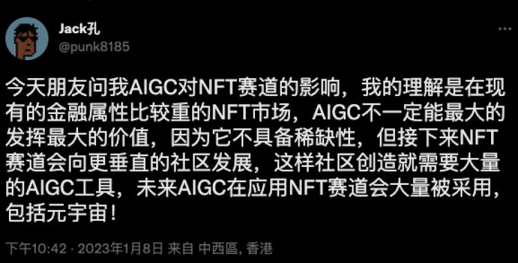 巴比特讯,推特账号“Jack孔”,即Nano Labs创始人孔剑平在推特发文称:“今天朋友问我AIGC对NFT赛道的影响,我的理解是在现有的金融属性比较重的NFT市场,AIGC不一定能最大的发挥最大的价值,因为它不具备稀缺性,但接下来NFT赛道会向更垂直的社区发展,这样社区创造就需要大量的AIGC工具,未来AIGC在应用NFT赛道会大量被采用,包括元宇宙。”